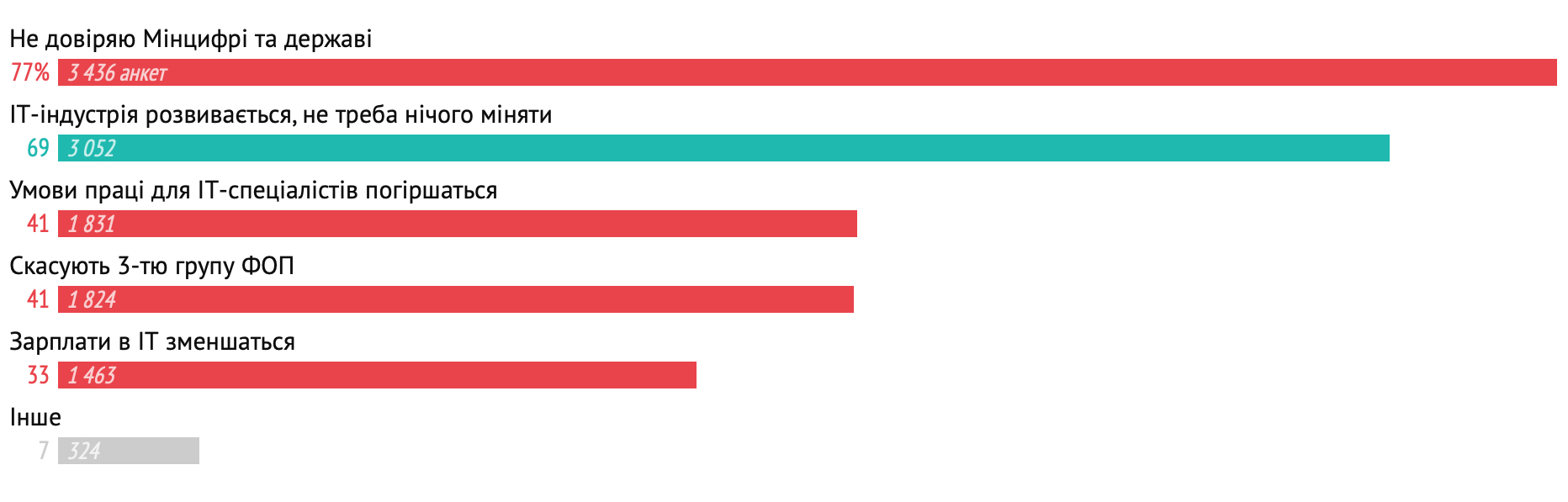 Водночас опитування серед самих представників IT-сфери показало, що 79% виступають проти його впровадження, а підтримують – лише 9%. Більшість айтішників зазначили, що не довіряють Мінцифрі та державі. Половина опитаних заявили, що не підтримають Дія City за жодних умов.