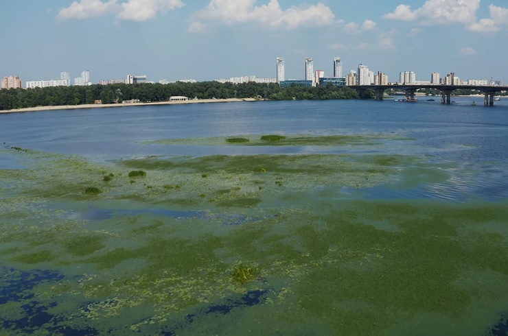 Екологи говорять, що найчастіше річка страждає від фосфатного забруднення. Під час попадання в Дніпро вони створюють умови для розвитку синьо-зелених водоростей. Процес забруднення води погіршується вищезазначеною відсутністю течії в річці і теплою погодою. Розвиток синьо-зелених водоростей призводить до зменшення кисню у воді і головна водна артерія України починає цвісти.