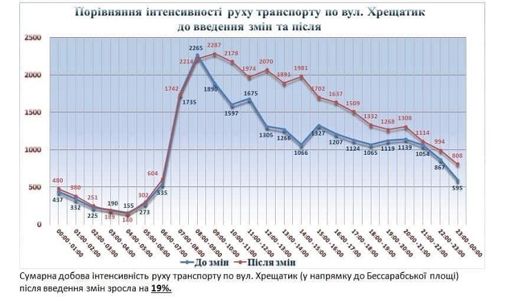 Перетин Хрещатику підземним переходом займає одну хвилину, наземним (з перетином дороги двічі та очікування зеленого сигналу світлофору) – дві. За п’ять циклів перемикання світлофорів, підземним переходом скористувались 99 пішоходів, а наземним – 520.