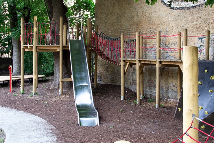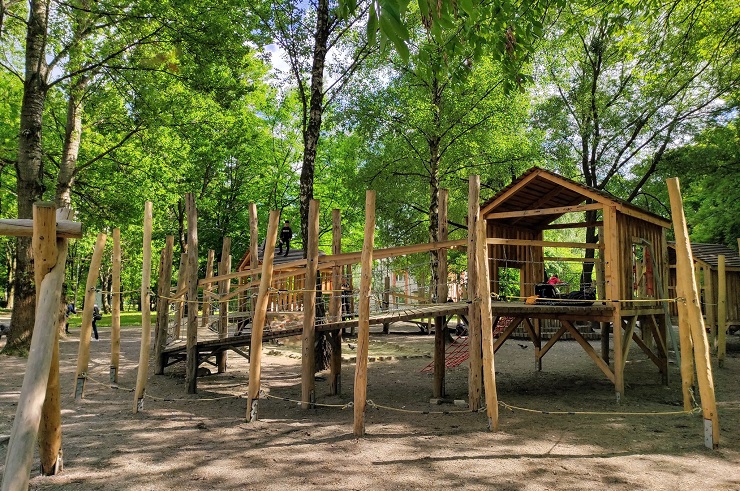 Основними складовими дитячих майданчиків є канати, дерево та природний ландшафт.