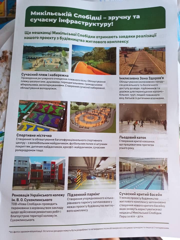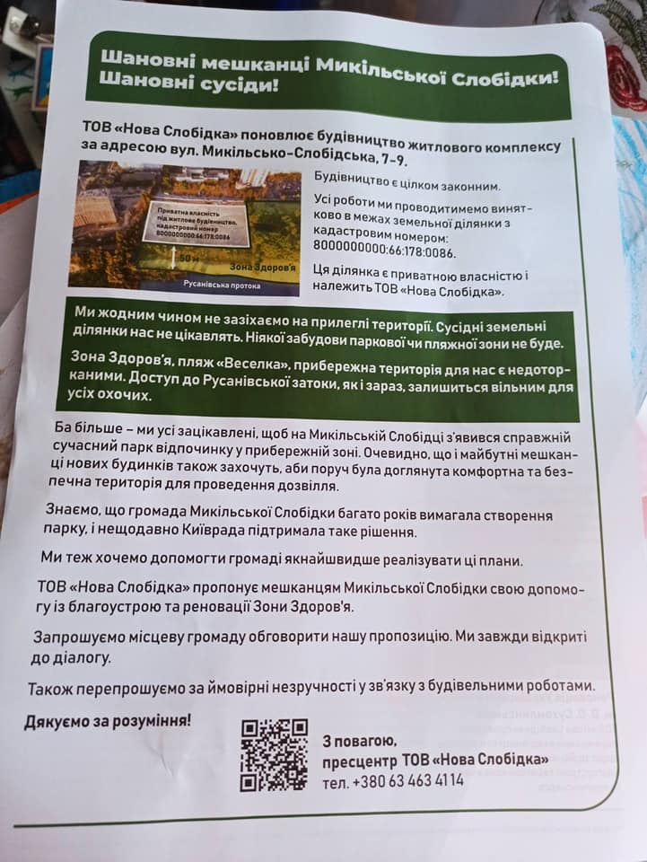 Також повідомляється, що забудовник – ТОВ «Нова Слобідка» – розкидав у поштові скриньки листівки, в яких попереджає про поновлення будівництва ЖК і запевняє, що сусідні земельні ділянки його не цікавлять. Також обіцяє облаштувати парк, басейн, каток, паркінг і «Зону здоров’я». Остання – це рекреаційна зона, створена зусиллями місцевих мешканців, реалізована коштом Громадського бюджету в 2017 році.