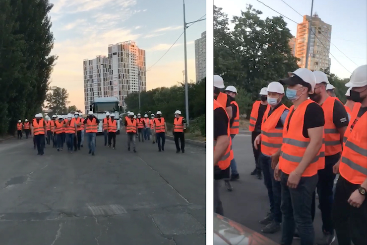 Мешканці публікують відео, на яких видно будівельну техніку, що рухається у супроводі натовпу з кількох десятків молодих чоловіків у будівельних касках та жилетах. На відео зафіксовано сутички з супротивниками забудови.