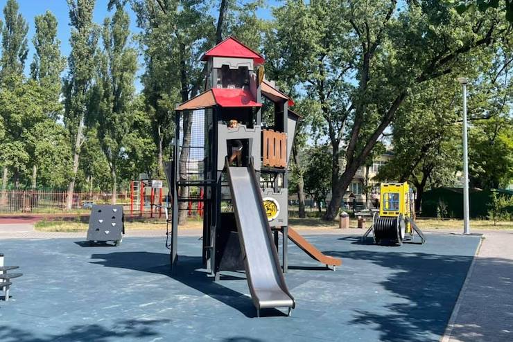 Зараз Київзеленбуд робить капремонт скверу на вулиці Ентузіастів, де, як видно з фото, так само встановили ігрову конструкцію Vinci Play:
