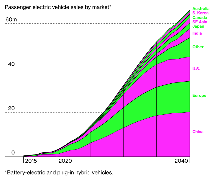 У найближчі 20 років продажі електромобілів різко зростуть – з трьох мільйонів в 2020 році до 66 мільйонів в 2040 році. Найбільше приватний електротранспорт домінуватиме в Європі та Китаї. Водночас автомобілі з двигунами внутрішнього згоряння, на думку аналітиків, вже досягли піку своїх продажів, і їх кількість буде зменшуватися.