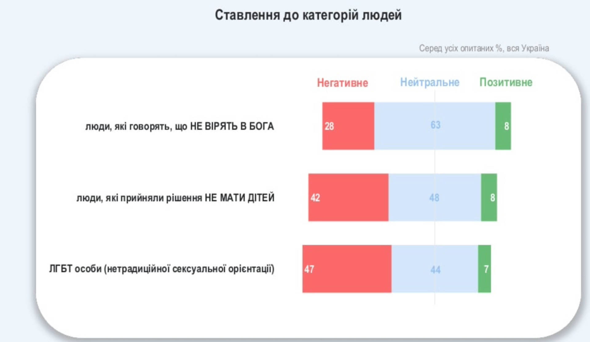 47% українців негативно ставляться до ЛГБТ, 42% – до чайлдфрі, 28% – до атеїстів. Такими є результати опитування соціологічної групи «Рейтинг», проведеного до 30-річчя Незалежності.
