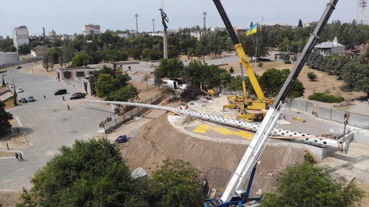 У Херсоні 70-метровий флагтшток із тризубом почали монтувати на набережній парку Слави біля обласної бібліотеки. Конструкція впала на автомобіль Lexus.