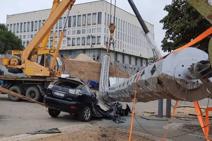 Найвищий флагшток Херсонщини впав, розчавивши Lexus чиновника (фото)