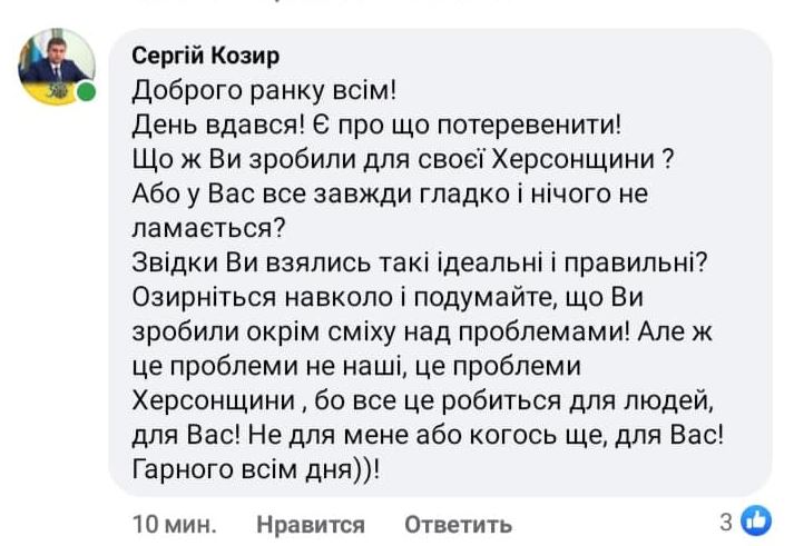 Соцмережі також поширюють реакцію голови Херсонської ОДА Сергія Козира.