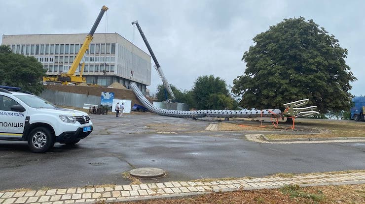 У Херсоні 70-метровий флагтшток із тризубом почали монтувати на набережній парку Слави біля обласної бібліотеки. Конструкція впала на автомобіль Lexus.