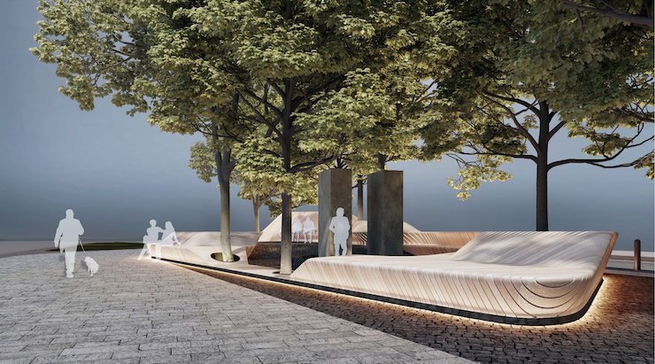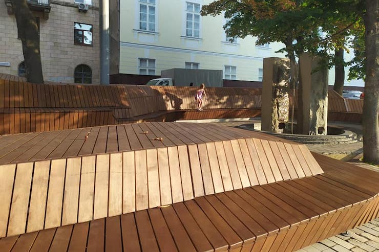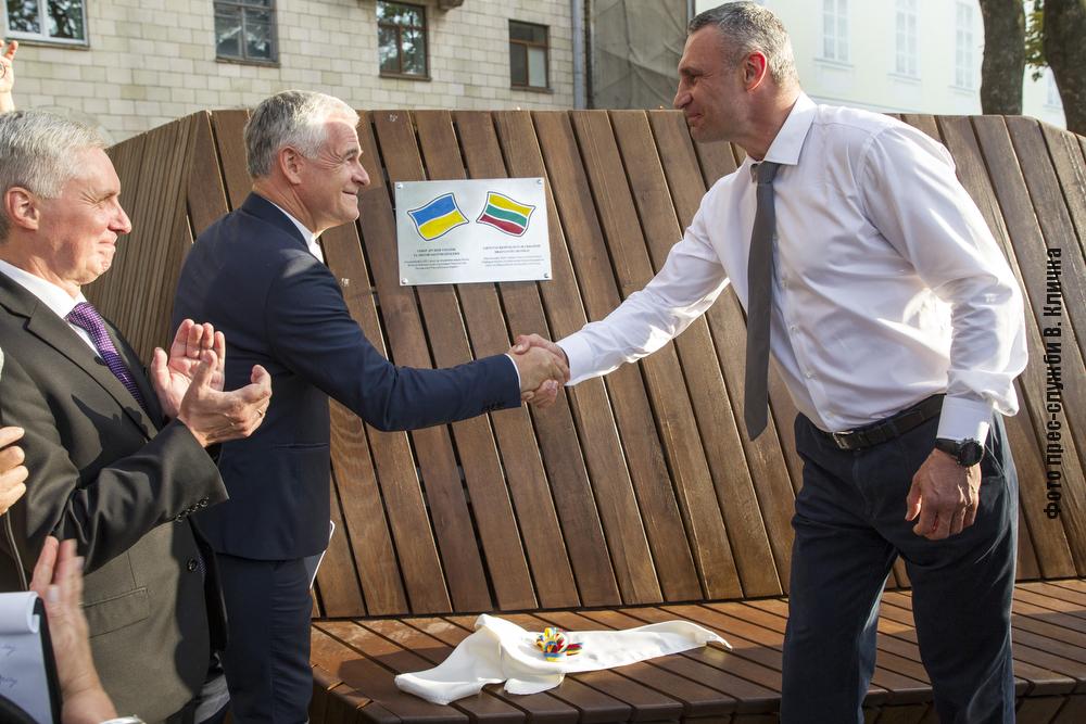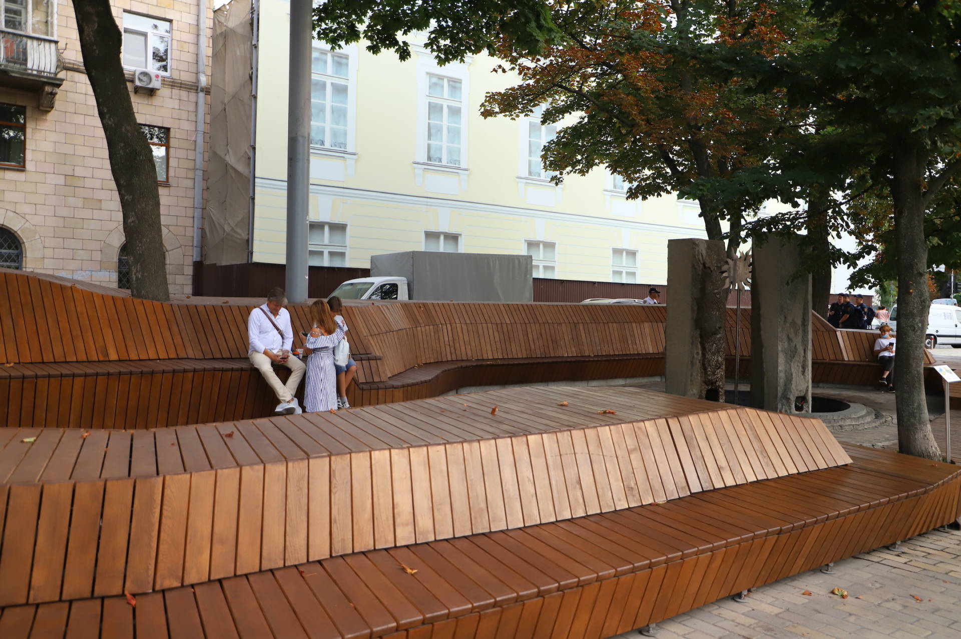 «Працювали над концепцією оновлення скверу спільно із литовськими архітекторами. Центральним елементом зеленої зони стала дерев’яна лава-тераса, яка формами нагадує бурштин або литовські дюни на узбережжі Балтійського моря. Лава має декоративне вечірнє підсвічування», – заявив на відкритті міський голова Віталій Кличко.