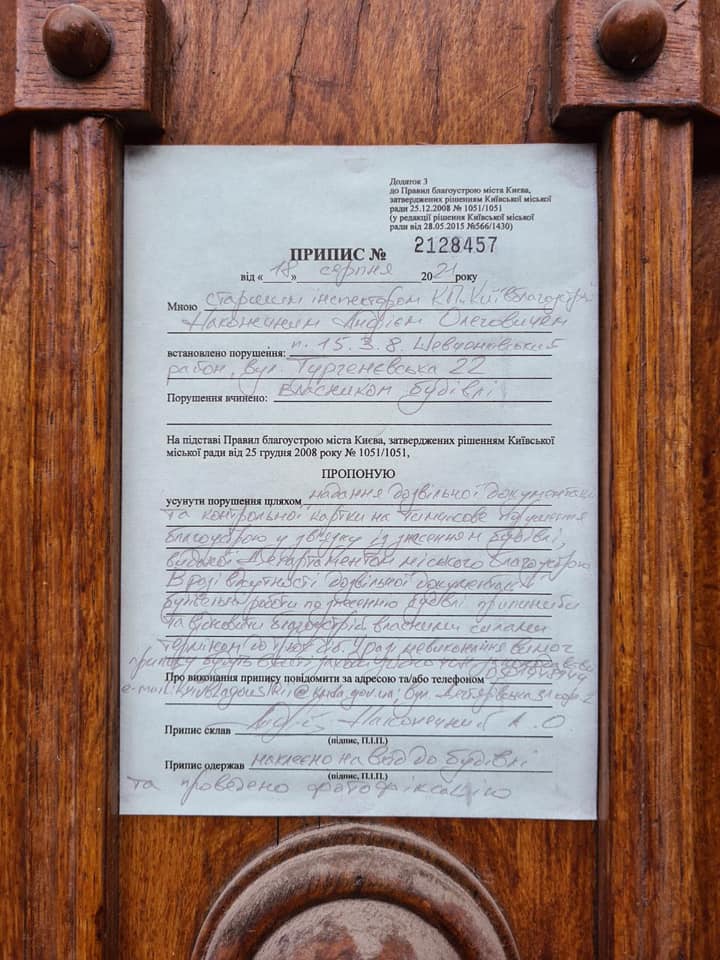 На дверях садиби було розміщено припис Департамент міського благоустрою КМДА – зараз його зірвано.