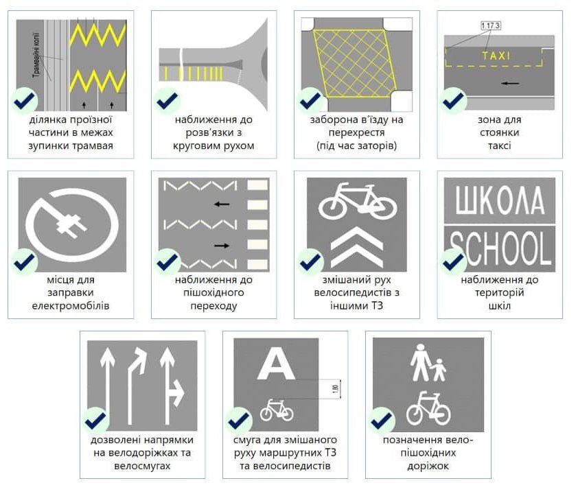 Новий ДСТУ 2587:2021 запроваджує жовту розмітку для заборони виїзду на перехрестя під час скупчення там транспорту. Також стандарт передбачає нові розмітки для позначення зупинки трамваю, місця зарядки електромобілів, наближення до пішохідного переходу, шкіл, кругового руху. Кілька розміток стосуються велосипедного руху.