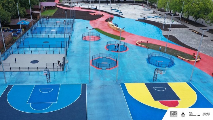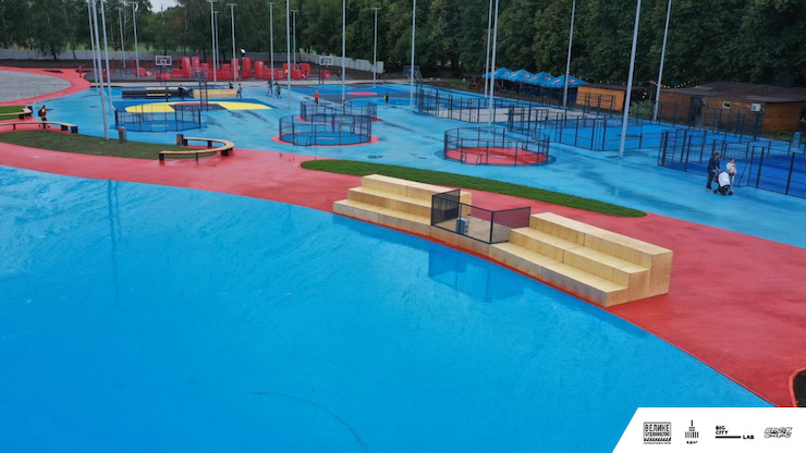 Зокрема, тут створили покриття, зручні для пересування на візку, сидіння різної висоти, зони активностей для різного віку, тренажери для людей на візках. Всі поверхні розташовано на одному рівні, а дизайн-код передбачає контрастні кольори, що дозволяє легко пересуватися скейтерам із поганим зором.