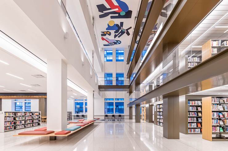 У центрі бібліотеки – великий видовжений атріум, який розділяє три поверхи зон для читання з одного боку та п’ять рівнів книжкових полиць із іншого.