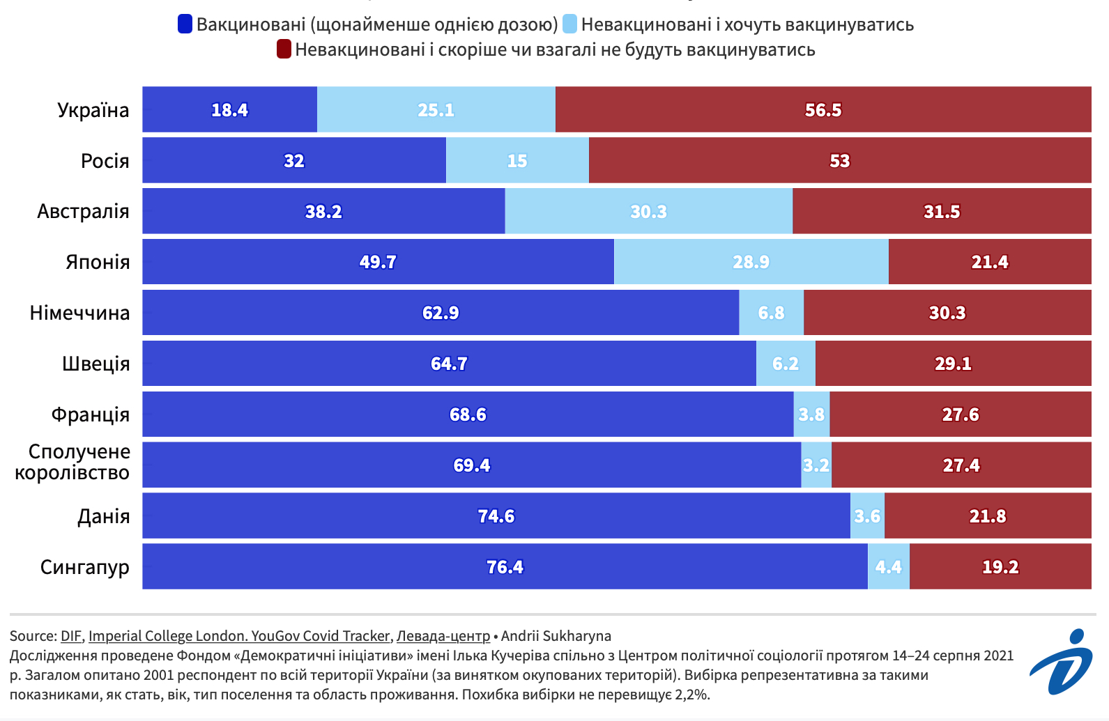 Водночас соціологічне дослідження, поведене Фондом «Демократичні ініціативи», свідчить, що понад 56% дорослого населення країни не планує робити щеплення проти коронавірусу. Ці показники одні з найвищих у світі, зауважують соціологи.