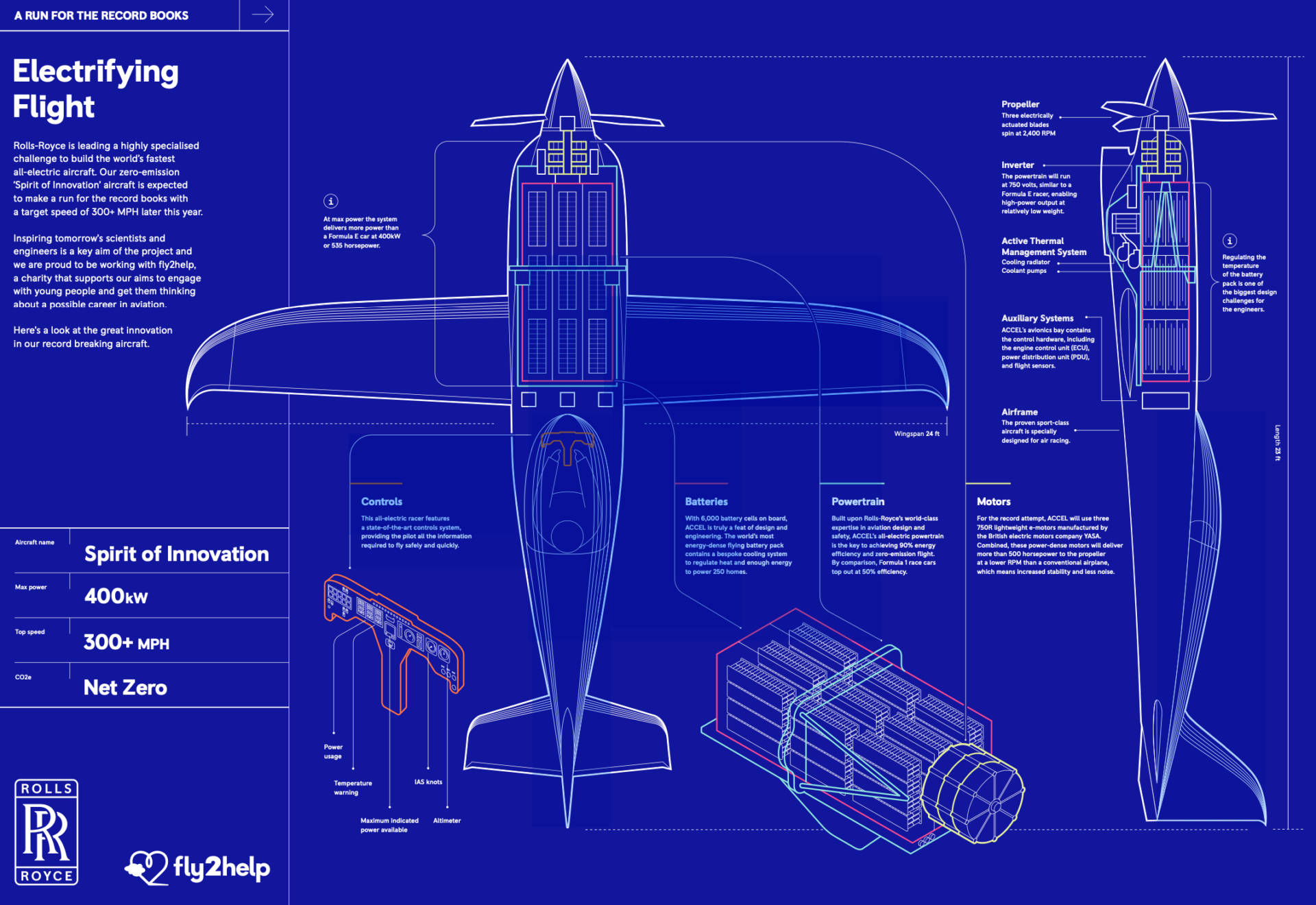 Spirit of Innovation — це одномісний низькоплан із пропелером у носовій частині, який приводиться у рух трьома електричними двигунами YASA загальною потужністю 500 кінських сил. Ті, своєю чергою, живляться від батарей, енергії яких вистачило б на забезпечення енергією 250 домогосподарств. Як видно зі схеми, батареї займають чимало місця в конструкції літака.