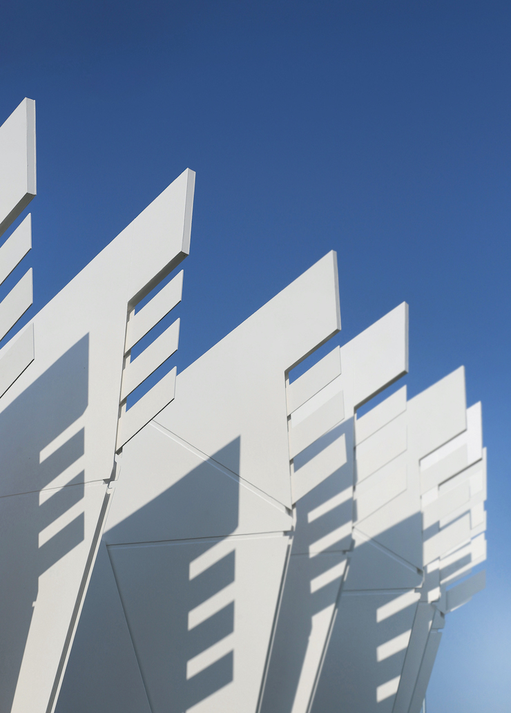 Поверхні облицювали плитами з природного каменю, а крила зроблено з металевого каркасу. Автори зазначають, що для більшої виразності застосували терасування навколо центру композиції.