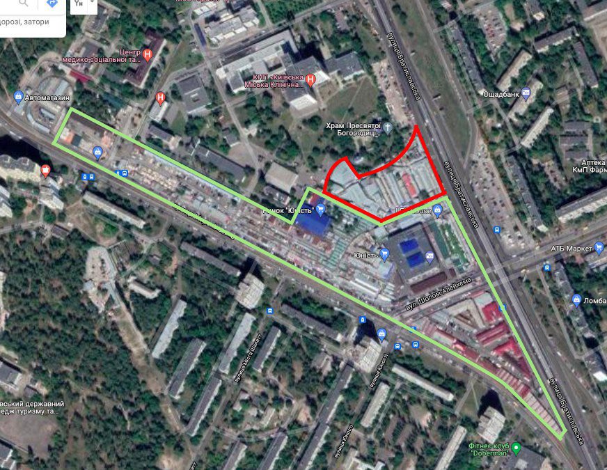 Червоним позначено демонтовану частину, зеленим — торговельні ряди, що лишилися. Зображення: Віталій Селик