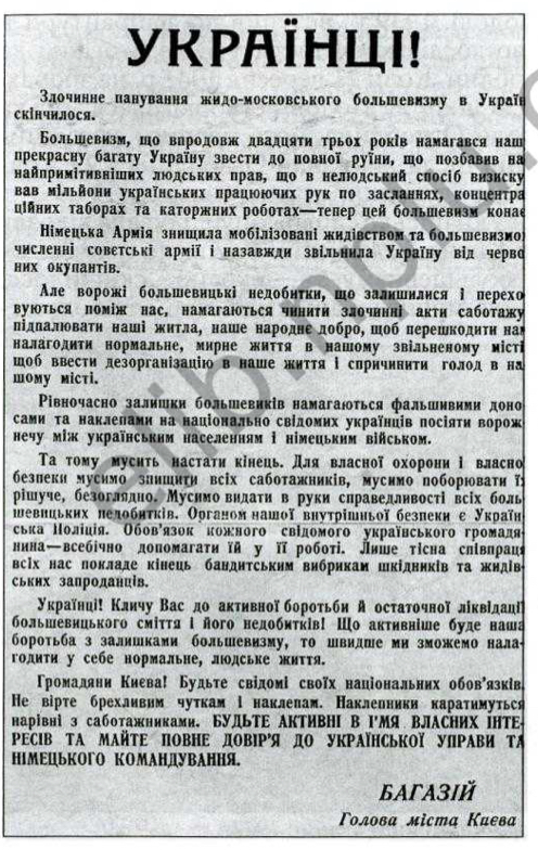 Звернення Багазія до киян у газеті «Українське слово», 2 листопада 1941 року. Скриншот з книги Івана Салія «Обличчя столиці в долях її керівників»