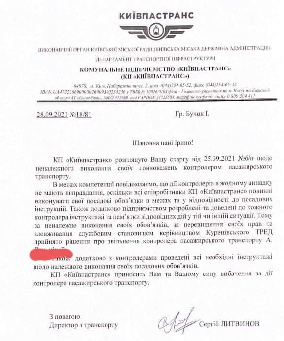 «Дії контролерів в жодному випадку не мають виправдання… КП “Київпастранс” приносить Вам та Вашому сину вибачення за дії контролера», – йдеться у листі.