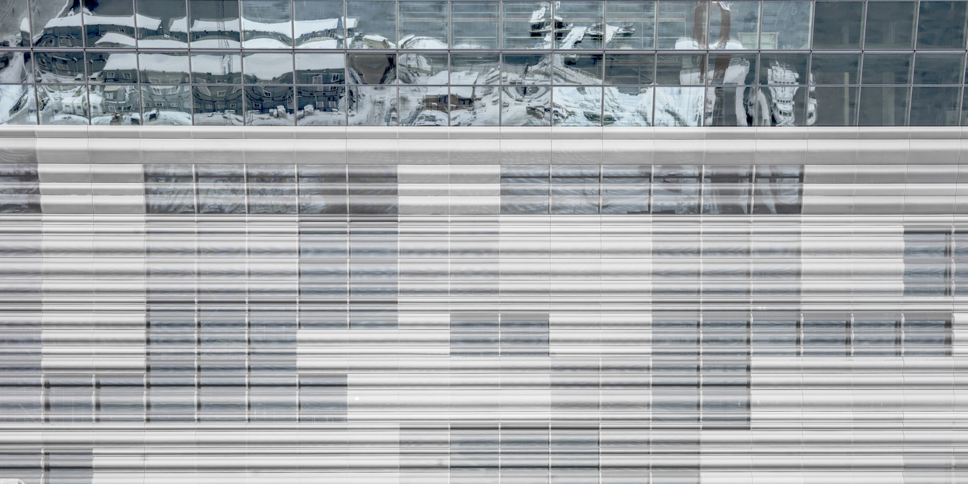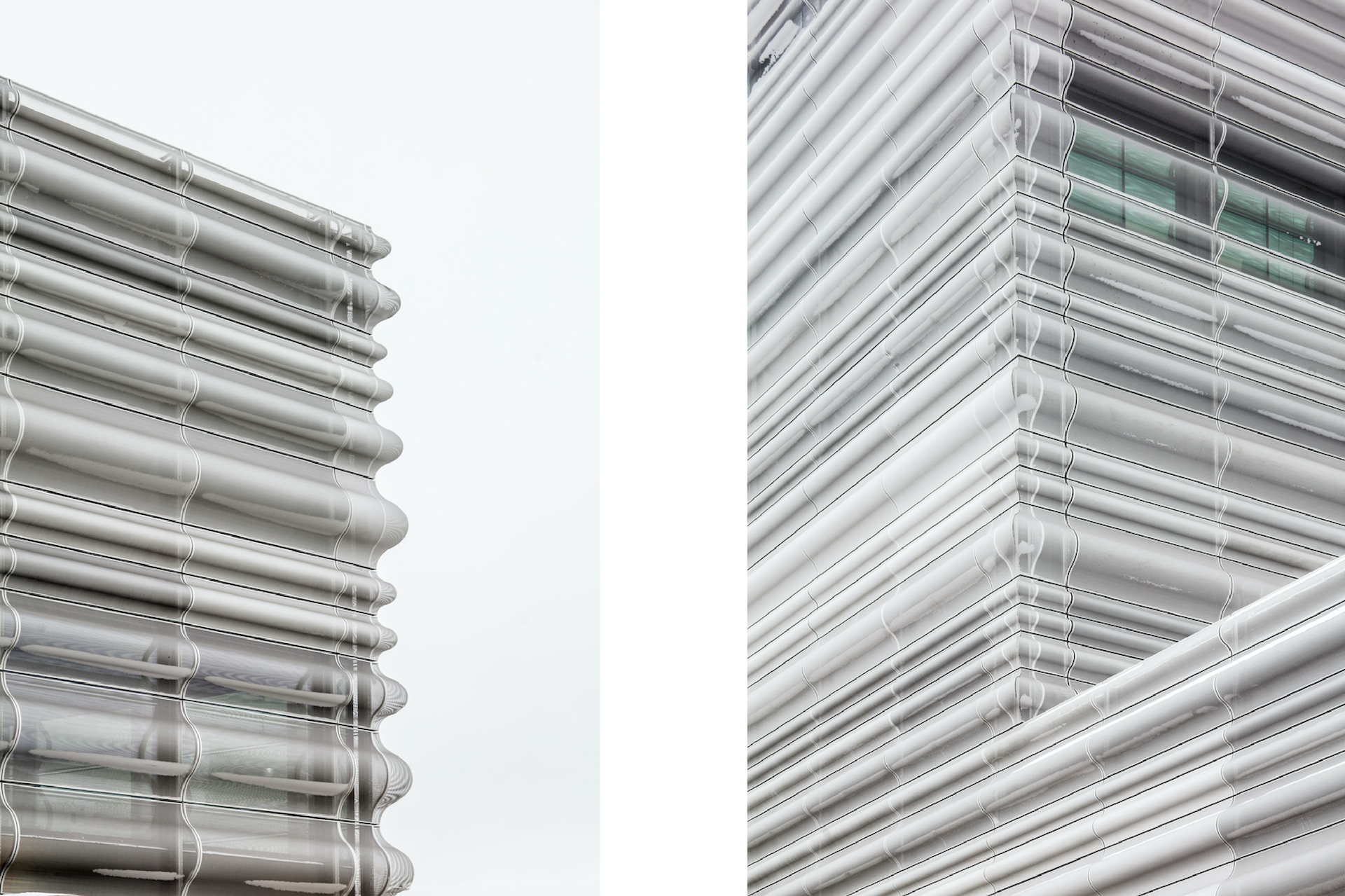 Фасад Музею Мунка огорнуто перфорованими панелями з переробленого алюмінію. Рівень прозорості панелей варіюється, що додає текстури фасаду. Фото: Adrià Goula