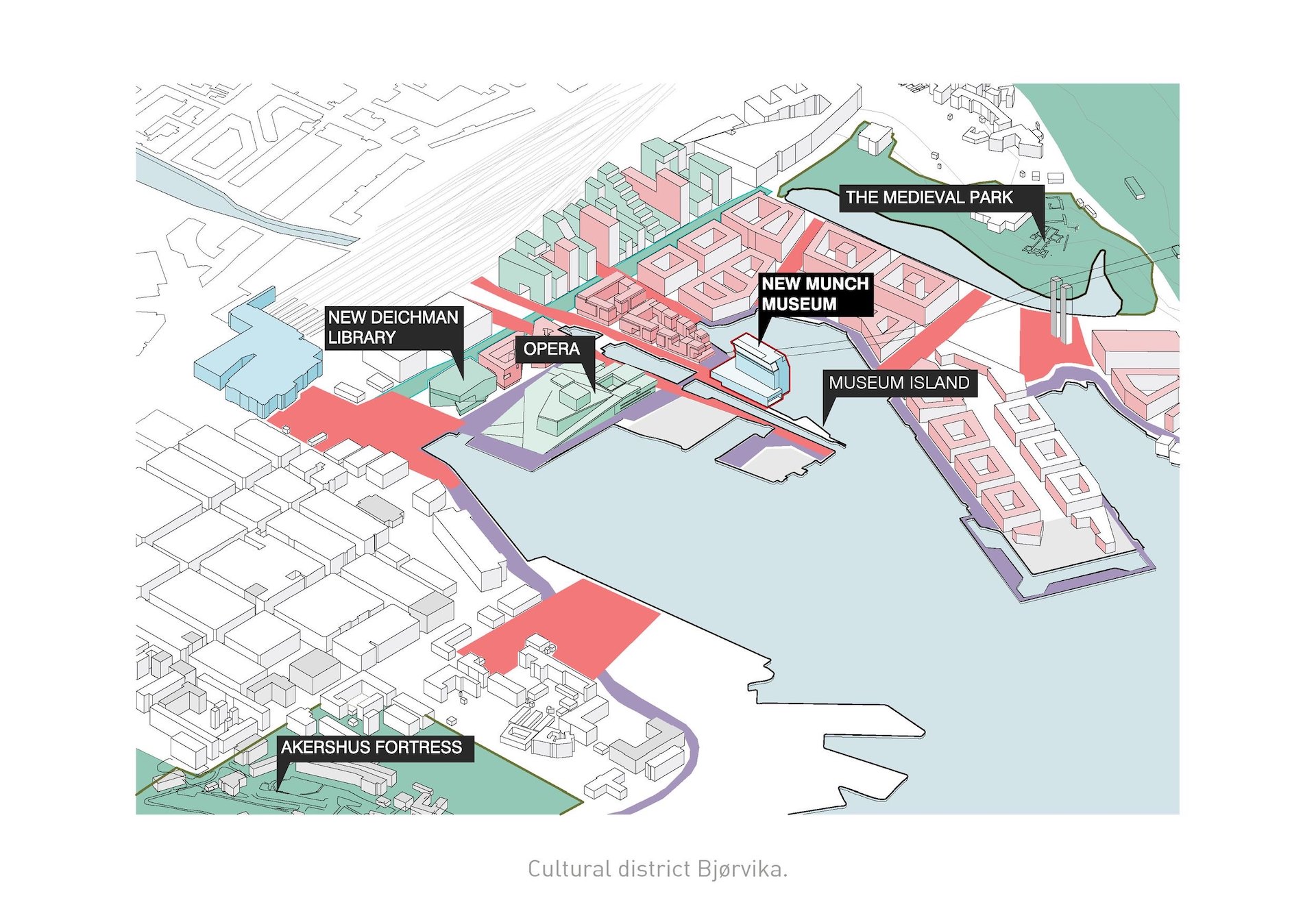 У 2008 році тут збудували знаменитий оперний театр за проєктом Snøhetta. У 2020 році поряд звели бібліотеку Дайкмана, цьогоріч відкривається нова будівля для Музею Мунка, а в 2022 році планують завершити будівлю, куди переїде Національний музей мистецтва, архітектури і дизайну.