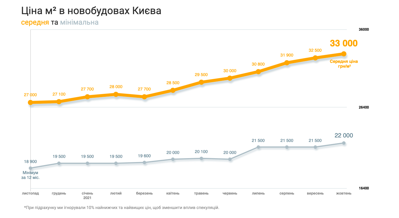 Ціни на первинне житло в Україні продовжують зростати. У Києві станом на перше жовтня середня вартість квадратного метра нового житла зросла з 32,5 тисячі до 33 тисячі гривень, за даними статистики ЛУН Місто.