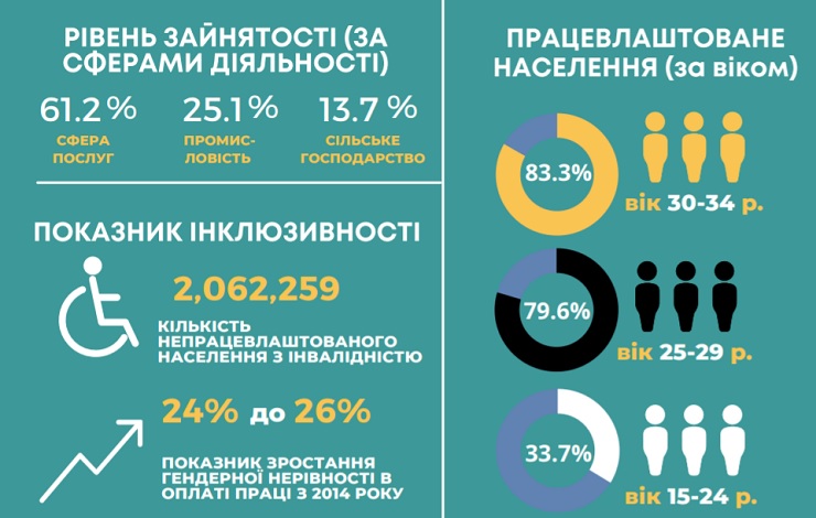 У дослідженні йдеться, що ситуація на українському ринку праці є досить складною для людей з інвалідністю: 73,8% або 2 062 259 осіб є безробітними. Крім того, на ринку праці спостерігається значна гендерна нерівність. Так, більшість чоловіків вважають, що має існувати поділ на «жіночі» і «чоловічі» професії.