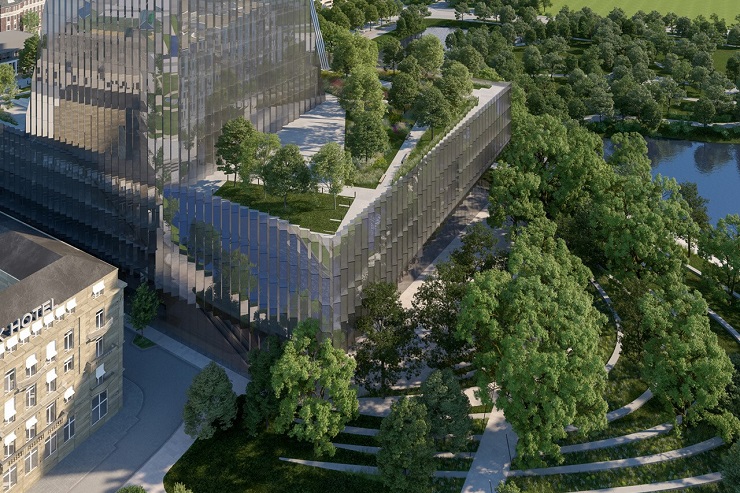 V-подібний силует, який створюють дві вежі, має на меті зменшити «затінення навколишнього ландшафту». При цьому скляний фасад забезпечить різні рівні прозорості для різних приміщень, розташованих в будівлі.