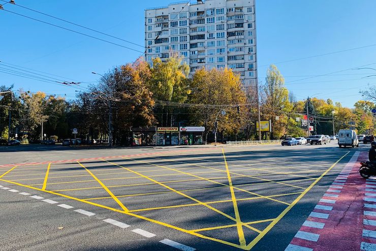 Крім цього на перехрестях з Солом’янської з Волгоградською / Андрія Головка та Максима Кривоноса / Генерала Шаповала нанесли коробчасту (вафельну) розмітку. Це перша така розмітка в Києві.