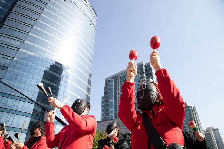 В Сеулі робітники страйкують у костюмах із «Гри в кальмара». Кажуть: реальність така ж, як і серіал