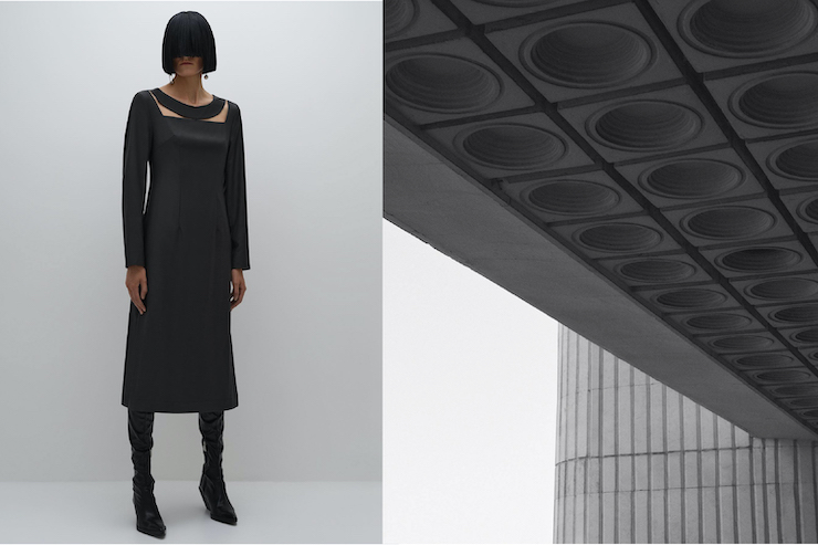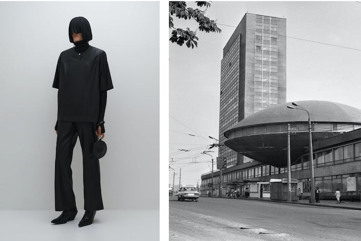 «Модерністські споруди завжди виділялися для мене на фоні міської забудови. Виразні та монументальні, з цікавим композиційним рішенням. Мені стало цікаво, як можна передати те, що створив архітектор, через одяг, і я вирішила спробувати. Так народився один з образів натхненний “Тарілкою” на Либідській площі. Я побачила цю споруду в образі статної дівчини з ноткою маскулінності, що передала через костюм з екошкіри з розширеною лінією плеча. А к руках маленький аксесуар, який було названо Kyiv UFO», — пояснює засновниця бренду PODYH Дар’я Плаксюк.