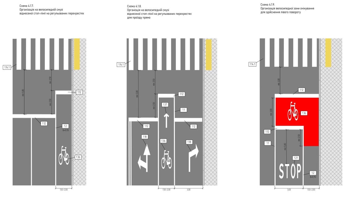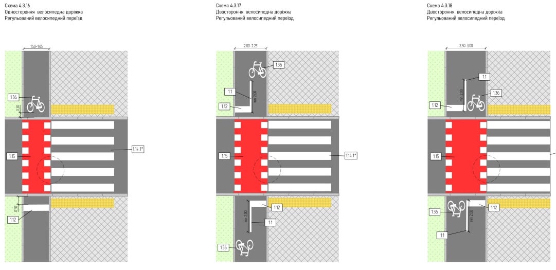 Є схеми, які стосуються випадків перетину з трамвайними коліями, конструктивного відокремлення велосмуг від зони паркування, велосмуг зустрічного руху, а також вулиць спільного руху велосипедистів та автотранспорту.