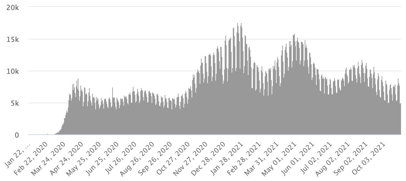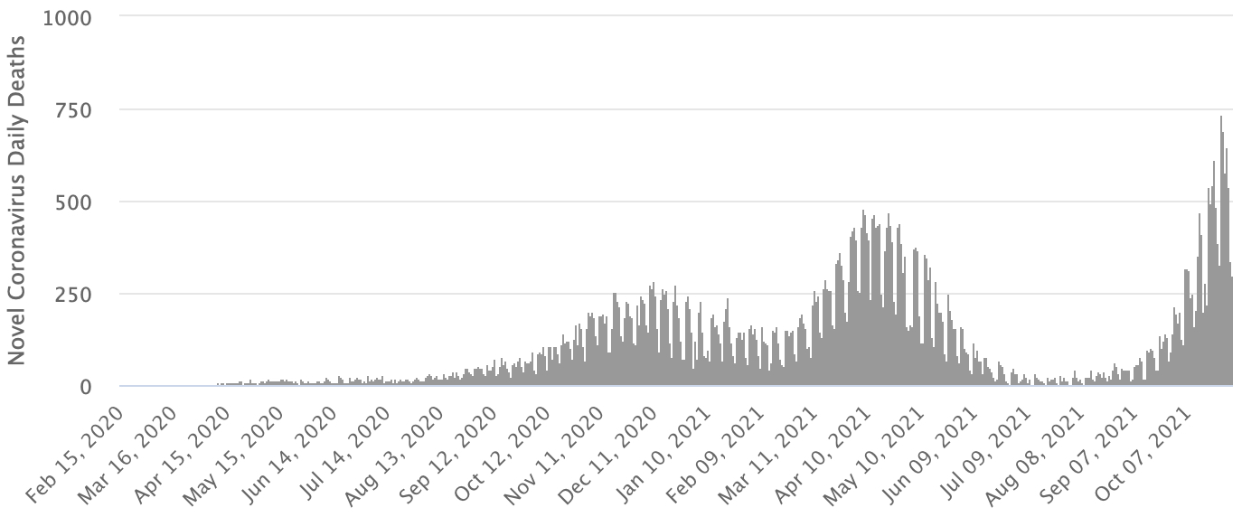 З середини вересня Україна увійшла у третю хвилю епідемії, яка виявилася смертельнішою за попередні, очевидно, через панування штаму «дельта». Якщо протягом літа фіксували не більш к 50 смертей щоденно, то лише за минулу добу першого листопада МОЗ повідомляє про 700 летальних випадків. Лише за жовтень у країні від ковіду померло приблизно 12 тисяч людей. Така динаміка контрастує з загальним падінням смертності у світі. Ситуацію в Україні пояснюють низьким рівнем вакцинації.