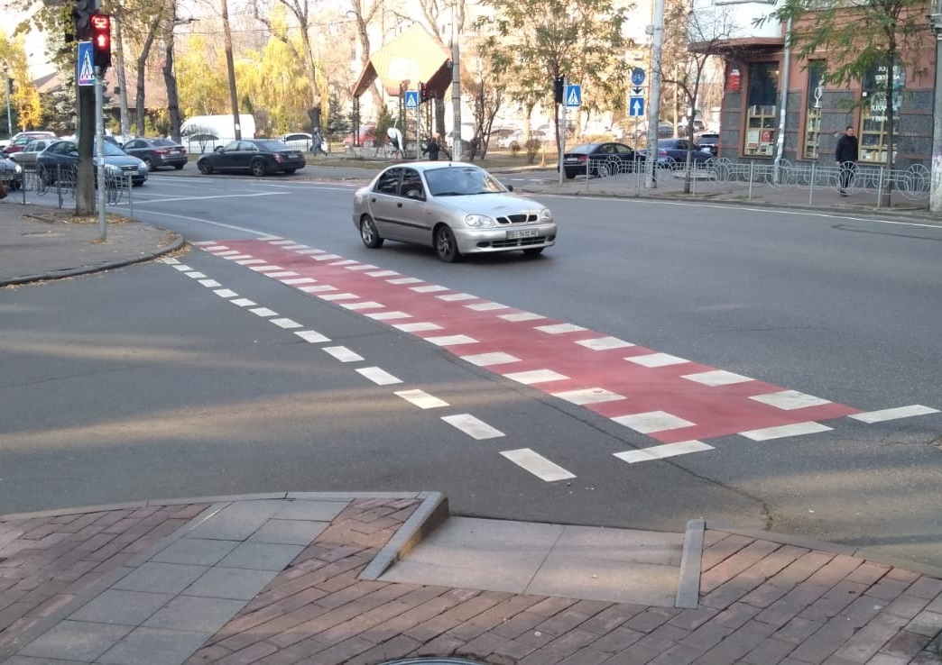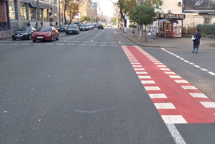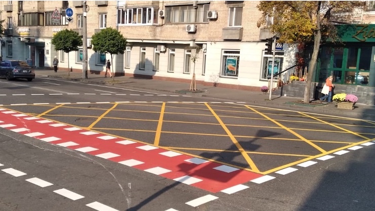 Перед цим на Солом’янській вулиці перерозподілили дорожній простір, зробивши замість трьох автомобільних смуг дві вужчі, смугу громадського транспорту та велосмугу. Там само нанесли першу в Києві коробчасту (вафельну) розмітку.