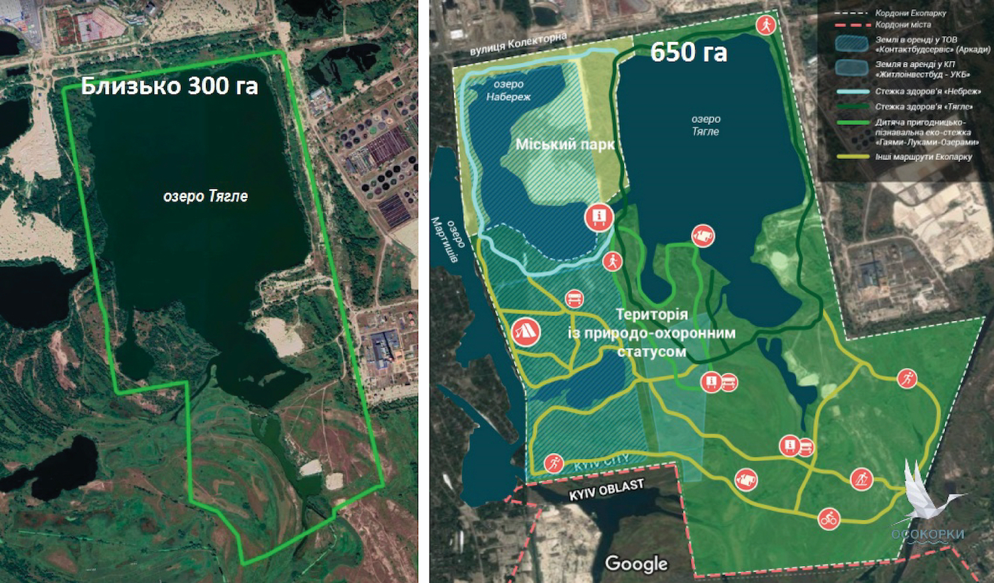 Ліворуч — межі «екопарку», запропоновані новою ГО «Національний парк збереження та збагачення флори й фауни «Осокорки». Праворуч — межі екопарку, які вимагає громада