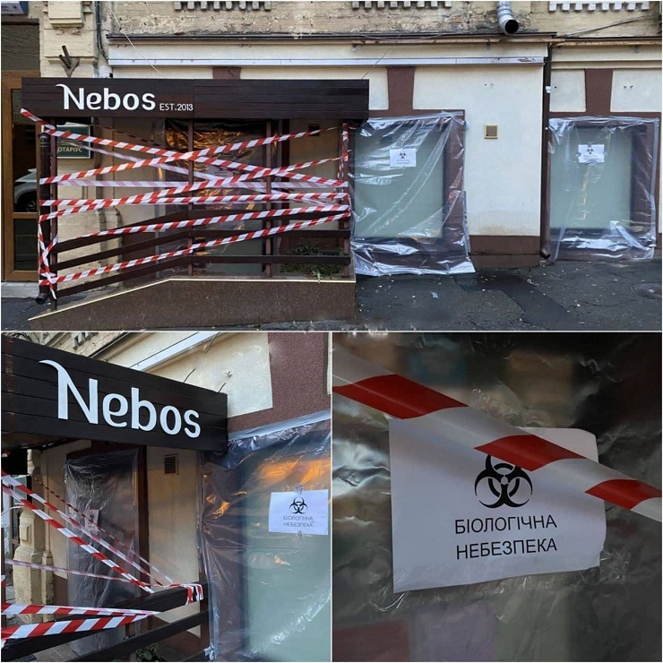 Ресторан Nebos на Малій Житомирській, поблизу Майдану Незалежності, опечатали плівкою, стрічками та написами «біологічна небезпека». Пізніше власники закладу зняли обмежувальні знаки та продовжили працювати у звичайному режимі.