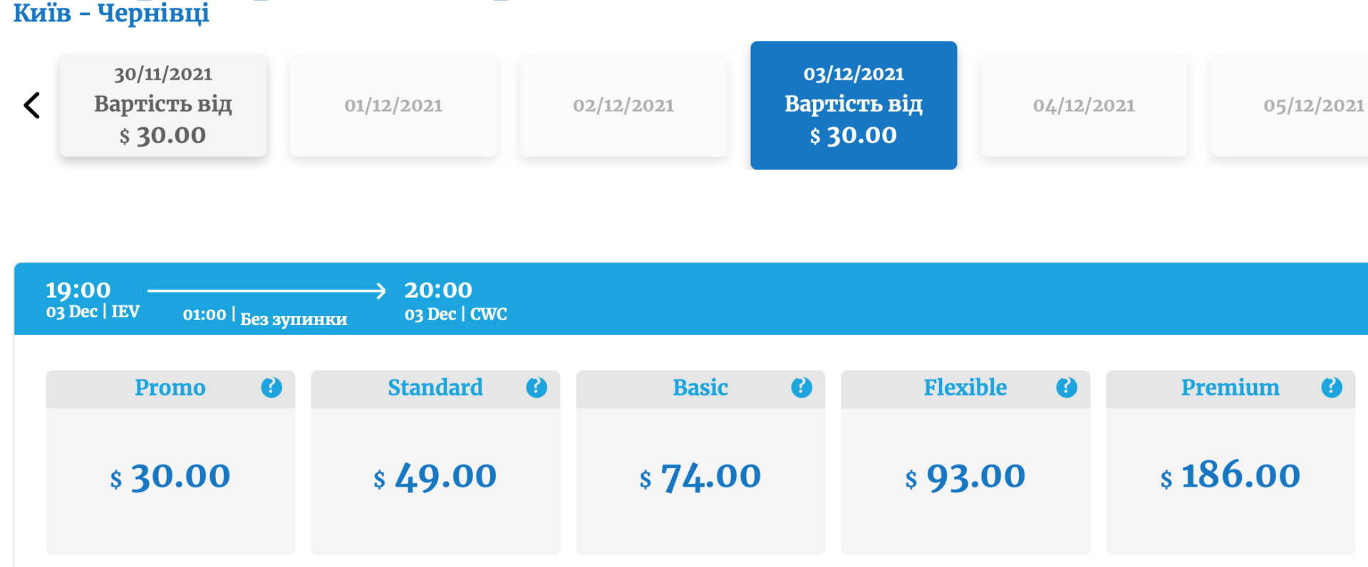 Скриншот із системи бронювання. Маршрут Київ-Чернівці