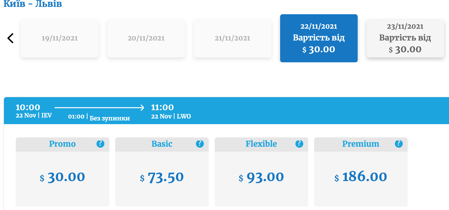 Скриншот із системи бронювання. Маршрут Київ-Львів