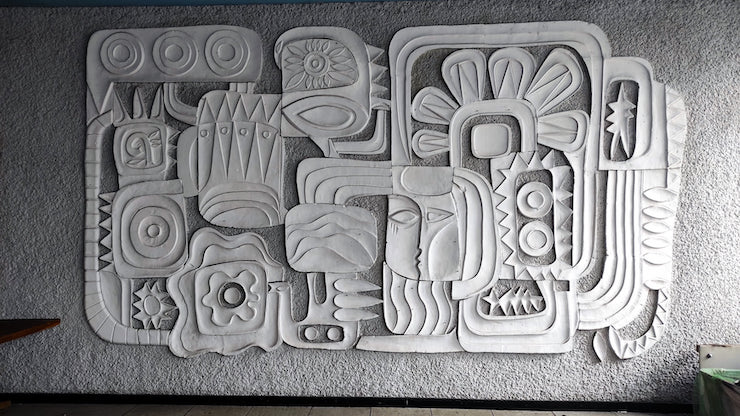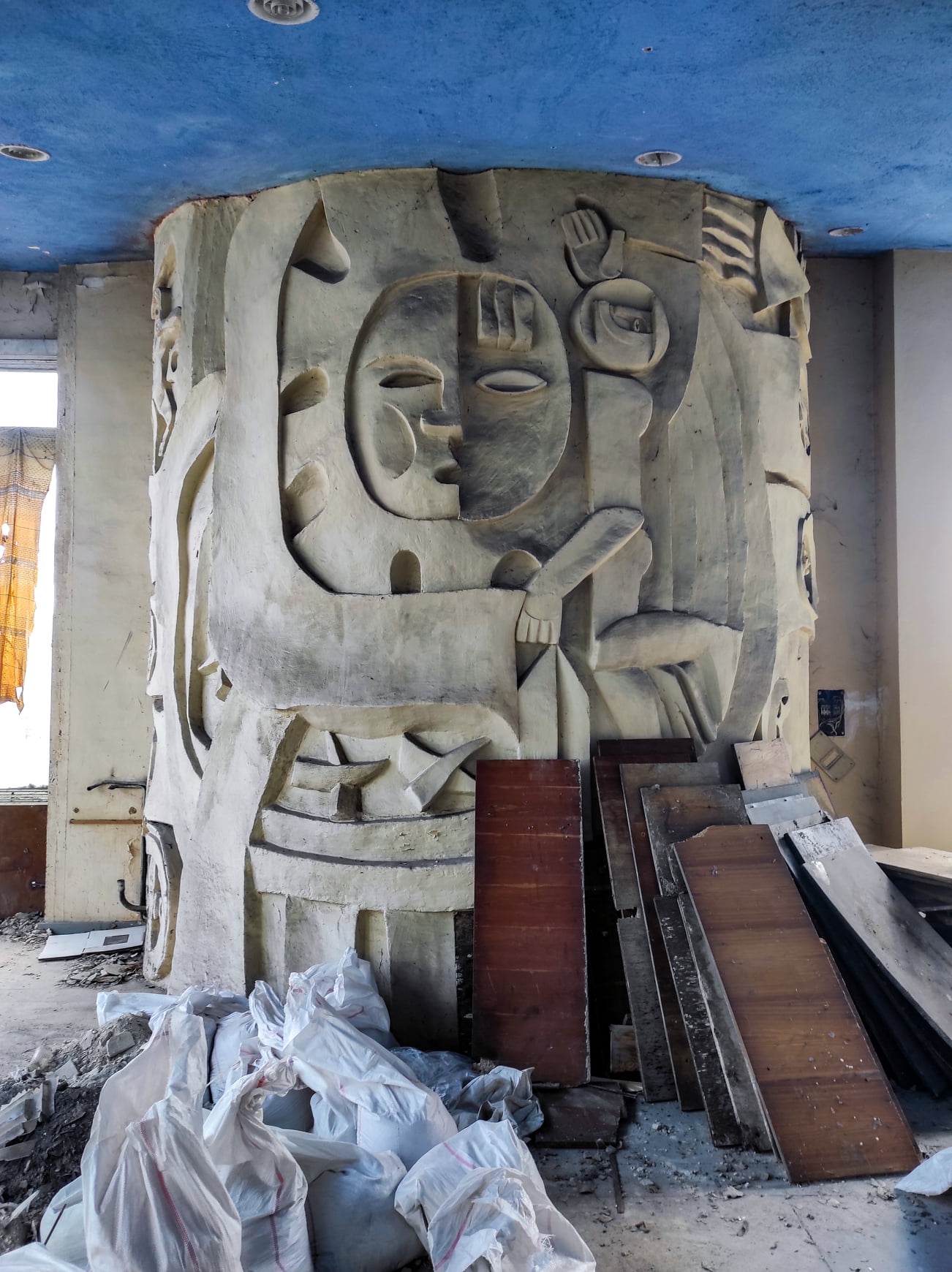 Колона з барельєфом у залі їдальні заводу «Електронмаш». Фото: Юлія Мельник