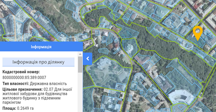 За даними кадастрової карти, ділянка перебуває у державній власності. Цільове призначення: для іншої житлової забудови для будівництва житлового будинку з підземним паркінгом.