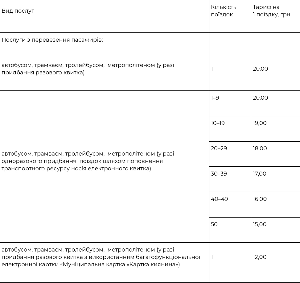 Разовий квиток у метро, трамваї, тролейбусі й автобусі коштуватиме 20 гривень. Таким чином вартість проїзду зросте більш як удвічі. При купівлі 50 поїздок на транспортну картку Kyiv Smart Card ціна кожної становитиме 15 гривень.