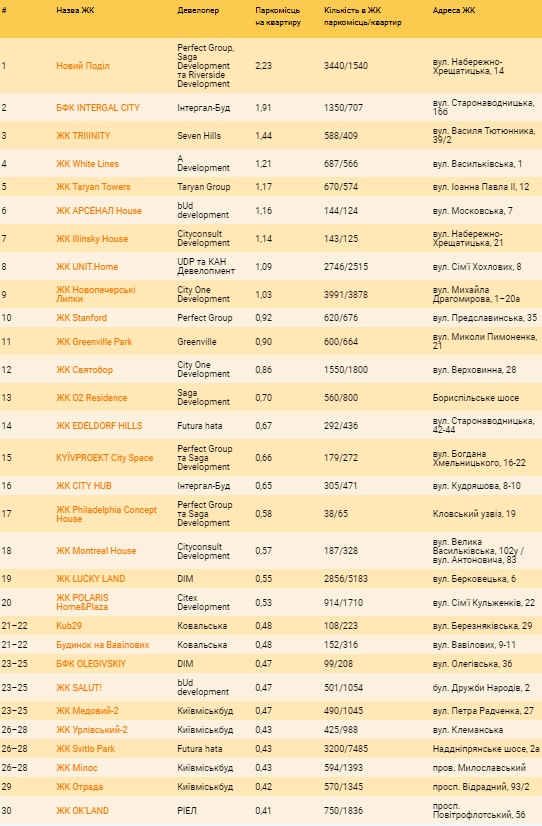 Команда відібрала 30 житлових комплексів із найкращим співвідношенням кількості паркомісць до кількості квартир.
