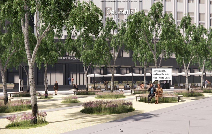 Ескізна концепція благоустрою Голосіївської площі біля метро розроблена Бюро ініціативної архітектури GA Влодка Зотова. Судячи з візуалізації, на площі встановлять лави, висадять дерева та облаштують нове покриття.