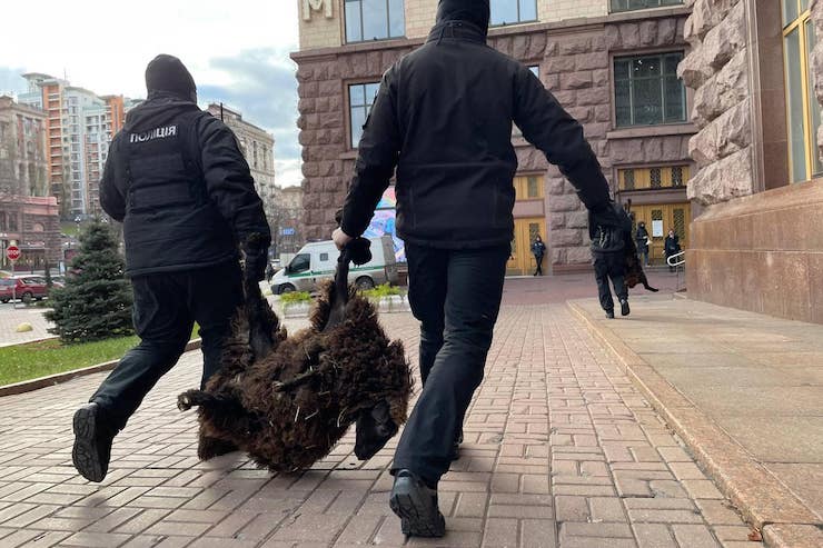 Однак тварин відразу конфіскувала поліція під розпачливі вигуки спікера з мегафоном: «Вилучають баранів! Вилучають наших баранів!»