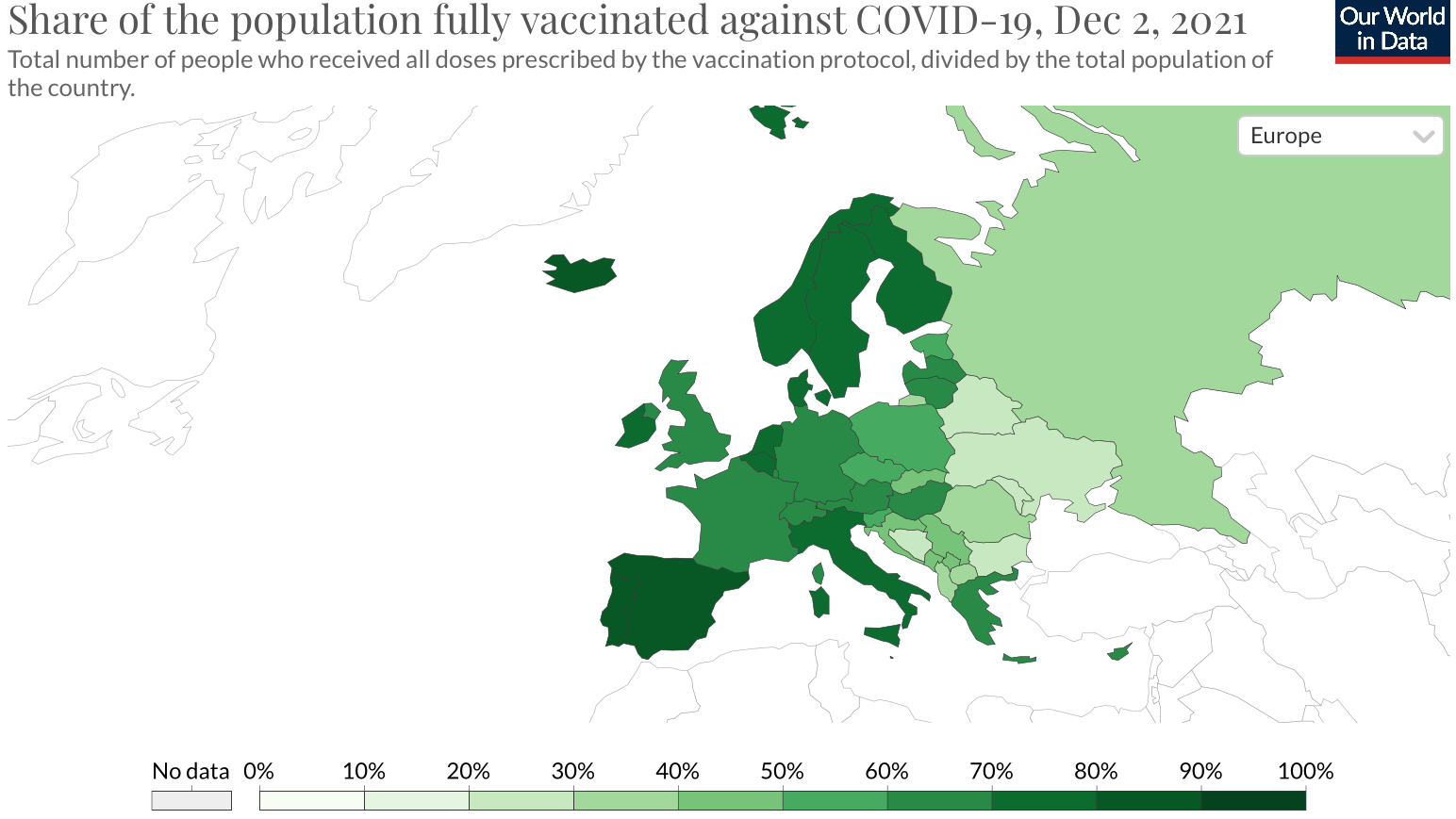 Відсоток вакцинованого від коронавірусу населення в Європі