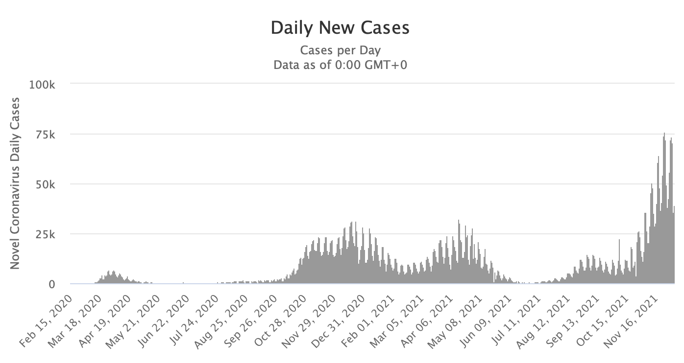 Наразі в Німеччині фіксують по 70 тисяч нових випадків COVID-19 на день, це найбільша хвиля у країні за весь час пандемії. Водночас смертність — значно нижча, ніж під час спалаху минулої зими. Повністю вакцинованими є 69% громадян.