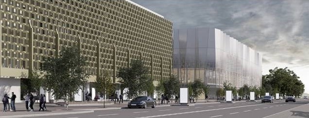 На фасаді буде використано три типи елементів: модуль максимально подібний до оригінального з анодованого алюмінію; плаский модуль зі швами, що роблять його подібним до впізнаваного оригінального модуля; плаский модуль без швів із композиту. У шарі стіни за композитним оздобленням розмістять утеплення.