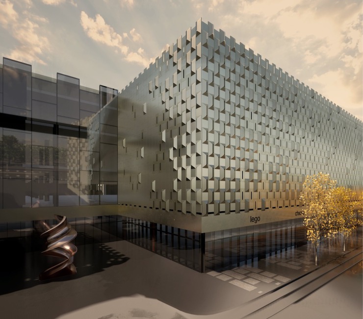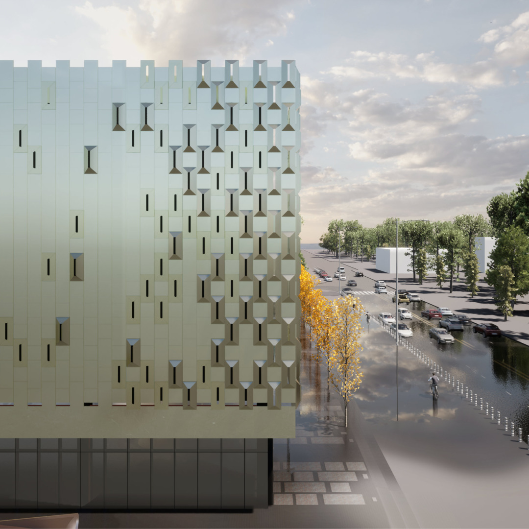 Автори зберегли оригінальний об’єм та впізнавані елементи первісного навісного фасаду із перфорованого алюмінію. Судячи з рендерів, пропонується зробити його тепло-сріблястого кольору. Зараз він має бронзово-золотаве забарвлення, що, за задумом автора оригінального проєкту Володимира Залуцького, мало нагадувати казкову золоту скриньку.