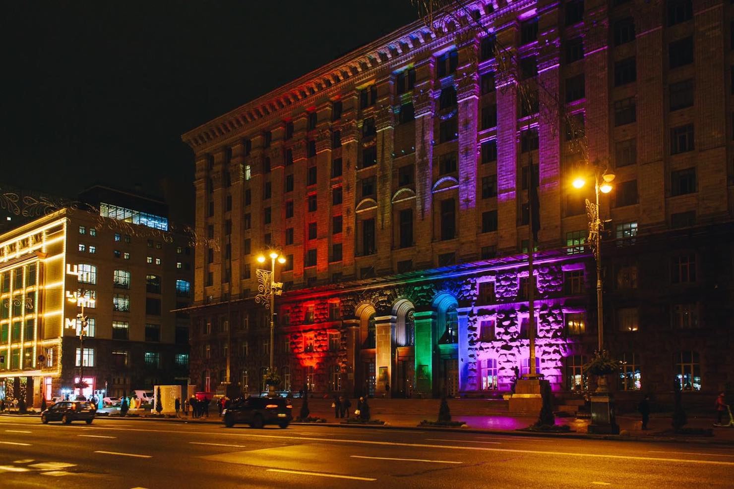 Увечері 10 грудня будівлю Київської міської державної адміністрації підсвітили кольорами ЛГБТ-символіки, повідомляє пресслужба КМДА.